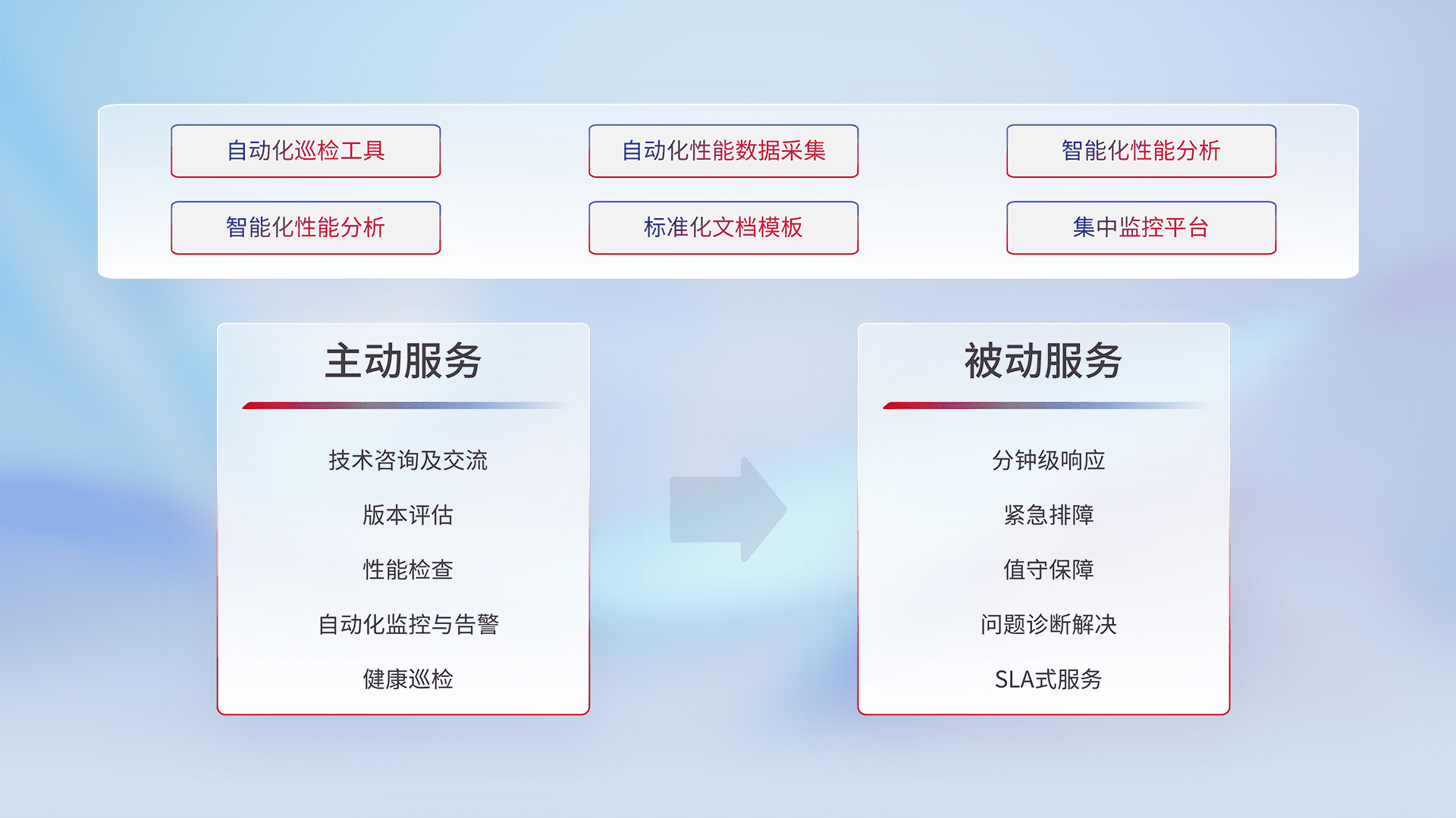 智能化工具和标准化文档,,,保障服务质量,,,提供主动服务(包含技术咨询、、版本评估、、性能检查、、、自动化监控与告警、、健康巡检)和被动服务包含(分钟级响应、、、紧急排障、、、值守保障、、、问题诊断解决、、、SLA服务)。。。