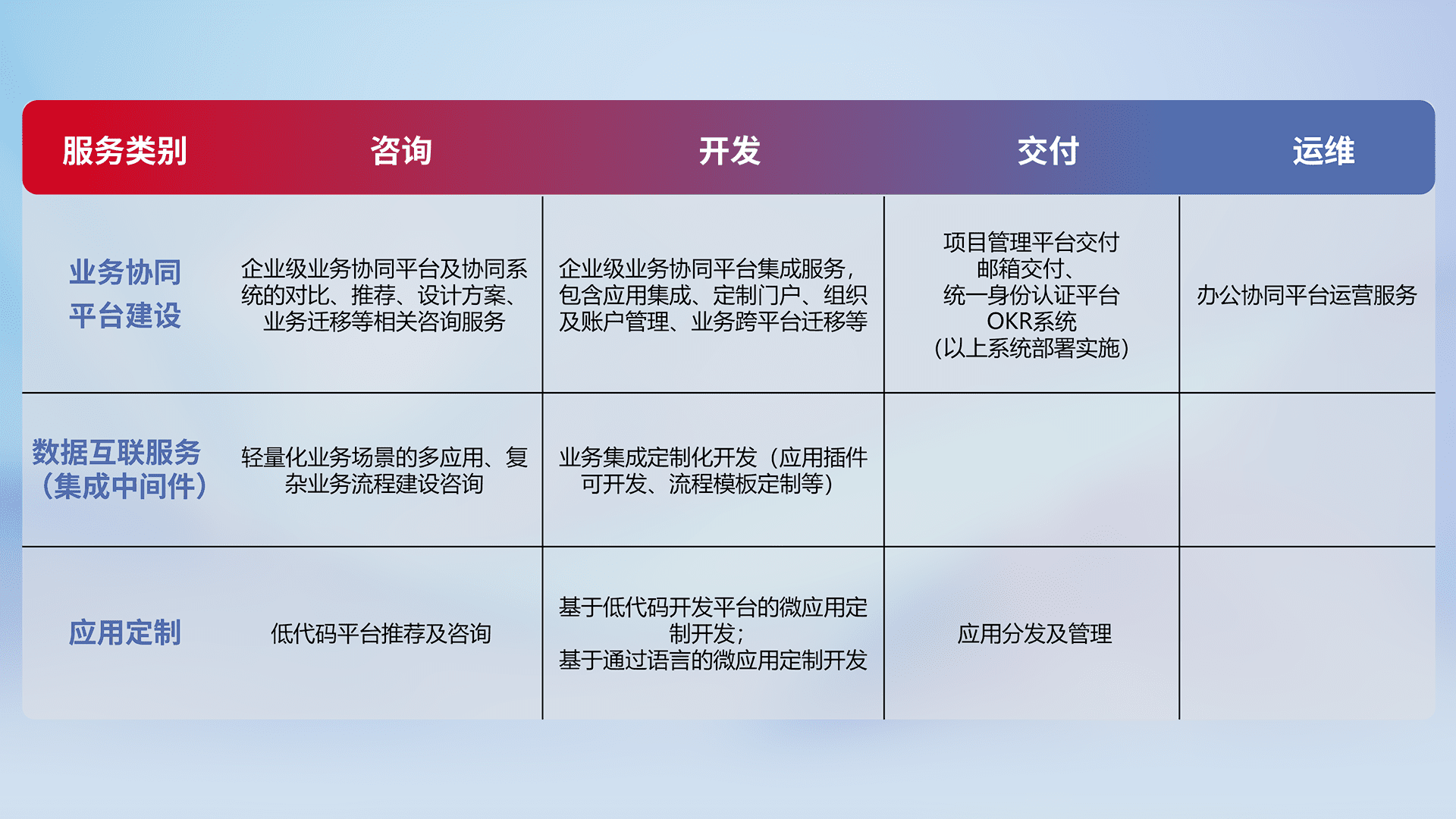 针对钉钉、、、企微、、、IDaas等平台级产品提供产品的规划、、、方案、、、交付、、、定制化开发等服务,,,实现如统一协同办公、、、、智能客户服务、、混合会议管理、、智能数据查询、、、等业务场景,,实现数字化转型。。。
